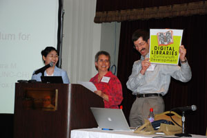 One Minute MadnessIn this ever-popular JCDL tradition, presenters at the Posters/Demos reception lined up for a rapid fire, 60-second opportunity to urge attendees to visit them and learn about their work during the reception. Some gone a thumbnail sketch of their poster or demo; others offered a more provocative approach, more akin to an advertisement than a summary.